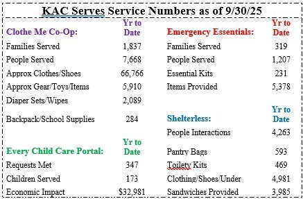 - We partner with our fellow KAC Serves ministries, government agencies, local shelters, community organization, and faith-based groups to help meet the most immediate and critical physical needs of individuals and families.